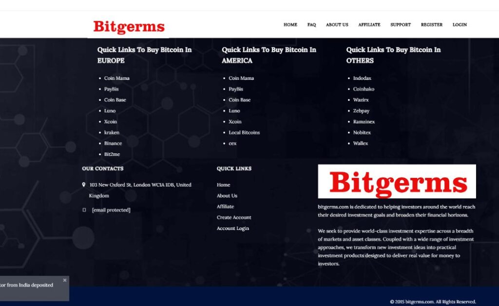 BitGerms (bitgerms.com) ненадежен из-за отсутствия лицензий и непрозрачных условий.