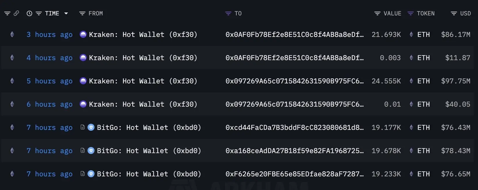 По данным Lookonchain, в течение последних семи часов активы с бирж Kraken и BitGo поступали на три новых кошелька. BitMine публично не подтверждала эти транзакции.