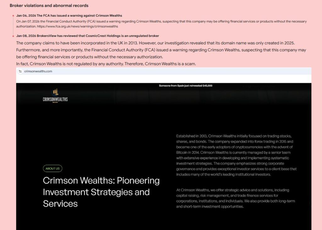 Crimson Wealths (crimsonwealths.com) демонстрирует признаки ненадежного брокера.