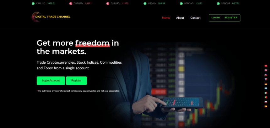 Digital Trade Channel брокер позиционирует себя как надежного партнера для торговли финансовыми активами. На сайте заявлены удобные условия, простая регистрация и круглосуточная поддержка. Компания обещает быстрые сделки и высокий уровень безопасности средств. Однако дата регистрации домена указывает на недавнее создание сайта. Это вызывает сомнения в заявленном опыте работы и репутации брокера.