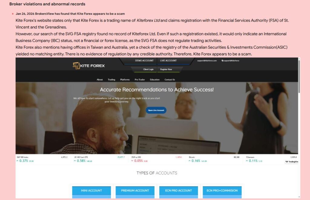 Анализ показывает, что KiteForex вызывает серьёзные сомнения.