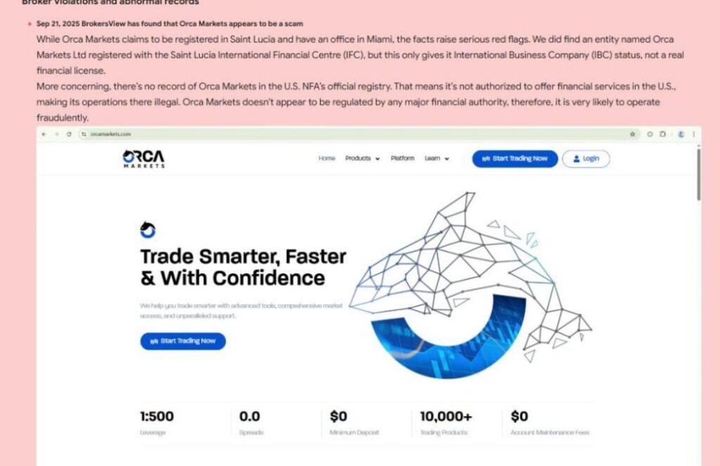 Orca Markets (orcamarkets.com) позиционирует себя как брокер с низкими комиссиями и быстрым исполнением. На сайте заявлены торговля на MT4/MT5, кредитное плечо до 1:500 и ECN-доступ. Указано, что минимальный депозит составляет 500 долларов США. Также брокер сообщает о поддержке множества индикаторов и алгоритмической торговли. Но официальная юридическая или лицензионная информация не подтверждается публично.