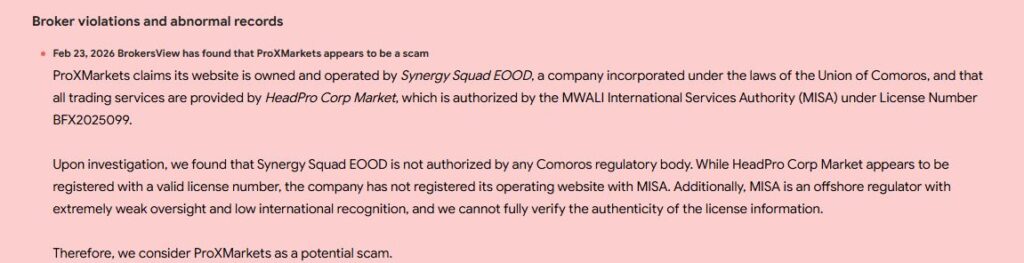 ProxMarkets (proxmarkets.com) показывает признаки мошенничества и высокого риска.