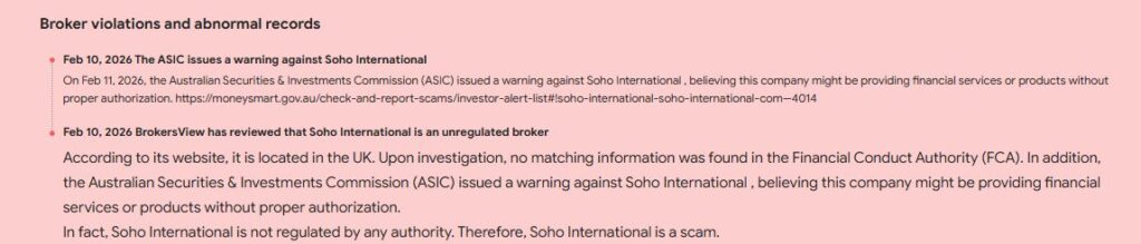 Soho International (soho‑international.com) демонстрирует признаки мошенничества.