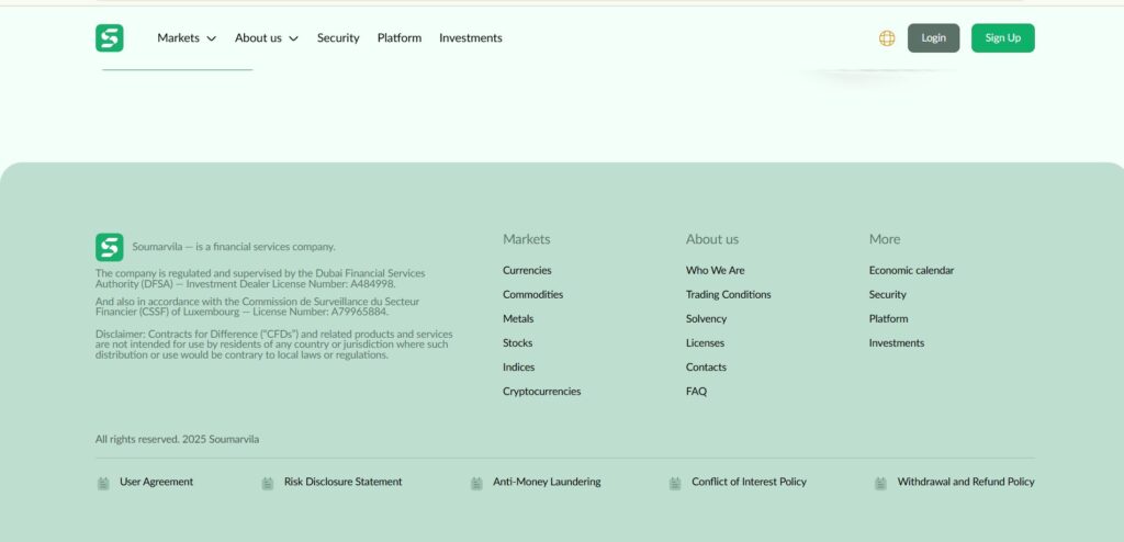 Раздел с торговыми условиями оформлен в ярком рекламном стиле. Указываются типы счетов и перечисляются возможные торговые инструменты. Точные размеры спредов и комиссий почти нигде не раскрываются. Не показаны реальные расходы по свопам и дополнительным сборам. В рекламных материалах Soumarvila брокер подчёркивает выгодные условия и потенциальную доходность. Однако без цифр оценить риски и затраты невозможно. Информация о поставщиках ликвидности на сайте отсутствует. Такой уровень непрозрачности часто сопровождает сомнительные проекты.