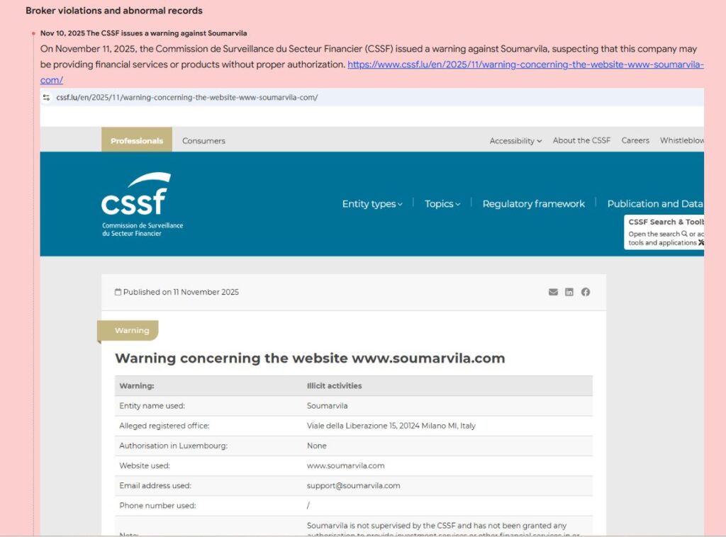 Soumarvila (soumarvila.com) демонстрирует низкий уровень прозрачности ключевых параметров. Юридическая база освещена слабо, реальное регулирование не просматривается. Клиенты могут столкнуться с серьёзными трудностями при защите своих интересов. Разумнее выбирать брокеров с подтверждёнными лицензиями и устойчивой репутацией.