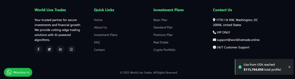 WorldLiveTrade (worldlivetrade.online) представляет себя как современную платформу для автоматической торговли и инвестиций. На сайте обещают высокий доход, ежедневные выплаты и лёгкий старт. Однако при проверке выявлено, что домен зарегистрирован недавно. Информация о владельцах и юридическом адресе отсутствует. Компания утверждает, что работает легально, но доказательств этому нет. Всё это вызывает серьёзные сомнения в надёжности проекта.